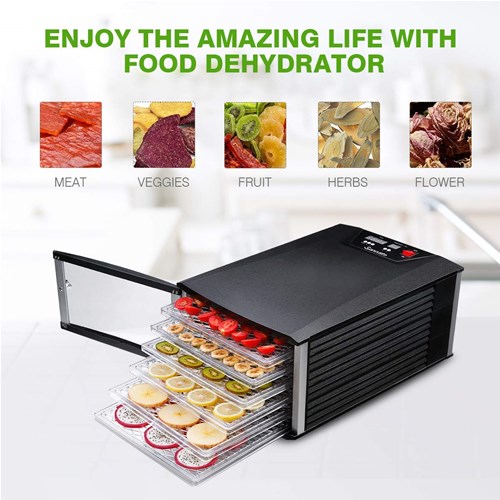 Efficace e semplice da utilizzare, questo essiccatore per alimenti consente di disidratare alla perfezione tante varietà di cibo: dalla frutta alla carne, dalle erbe agli ortaggi, dalla pasta ai fiori. La possibilità di regolare la durata delle sessioni di essiccazione e il livello della temperatura consente di lavorare nella maniera più idonea ogni diverso alimento: ciò significa ottenere prodotti disidratati ed asciutti senza perdere sapore e nutrienti. L'apparecchio è inoltre studiato per essiccare i prodotti in maniera uniforme: il suo funzionamento si basa su un sistema che agevola la circolazione omogenea dell'aria e sfrutta una strategica ventola posteriore per diffondere al meglio il calore e prevenire il surriscaldamento. In più, un meccanismo di spegnimento automatico impedisce alla macchina di rimanere accesa a lungo e preserva pertanto i cibi da eccessivo riscaldamento e secchezza.